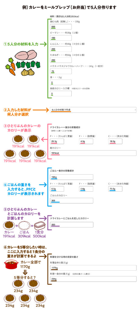 まとめて作り置きをするミールプレップレシピの計算ツールは、例えば5人分の材料を入力すると、1人分のPFCとカロリーを表示する仕様にしています。